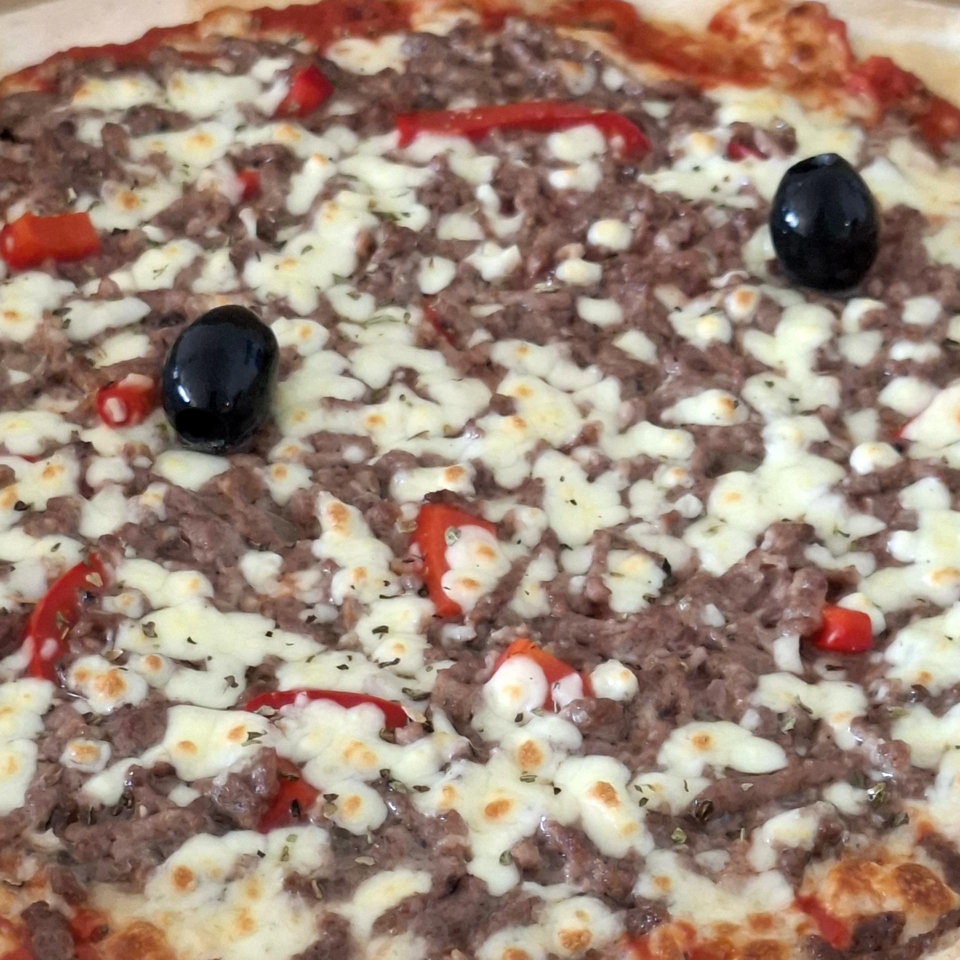 Base tomate,mozzarella,oignons,viande hachée,poivrons,origan,olives.