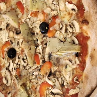 Base tomate,mozzarella,oignons,champignons,poivrons,artichauts,origan,olives.