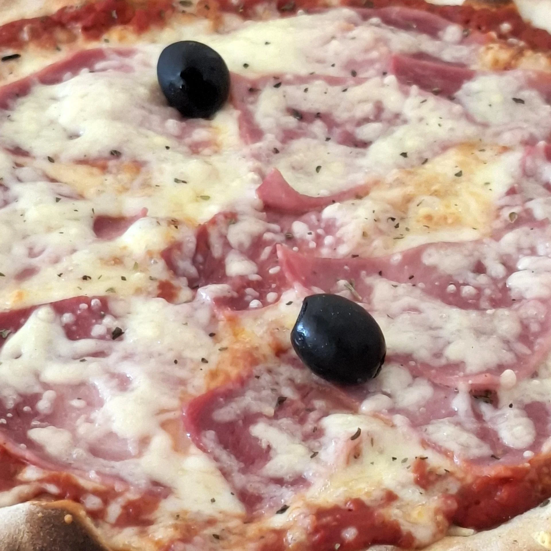 Base tomate,mozzarella,jambon blanc,origan,olives.
