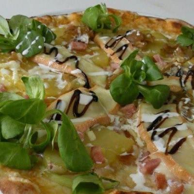 Base crème fraîche,mozzarella,oignons,pommes de terre,lardons reblochon,origan,olives.